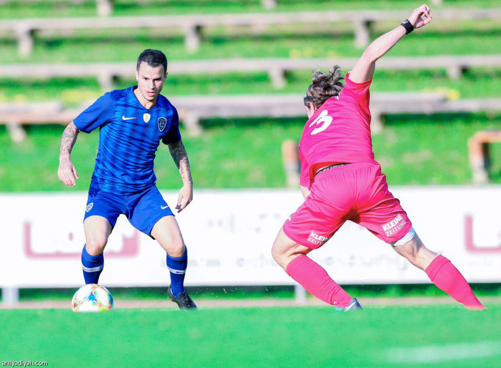 صورة التقطت للإيطالي جيوفينكو لاعب الهلال يحاور أحد لاعبي سبيتال النمساوي (المركز الإعلامي ـ الهلال)