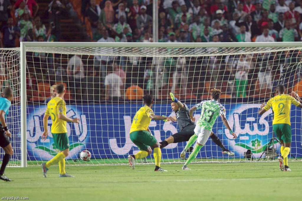 تأهل المنتخب النيجيري إلى نصف نهائي كأس الأمم الإفريقية 2019 بعد فوزه بنتيجة 2ـ1 على جنوب إفريقيا.. وفي الصورة التي التقطت أمس يظهر صامويل شوكويزي مهاجم النسور الخضراء أثناء تسجيله هدف الافتتاح (المركز الإعلامي ـ الاتحاد الإفريقي لكرة القدم)