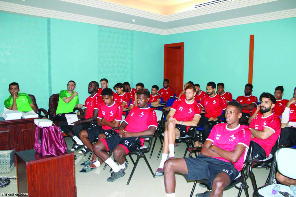 صورة التقطت أمس للاعبي فريق الاتفاق الأول لكرة القدم يستمعون إلى محاضرة ألقاها محمد الدعلان مدير الاحتراف في النادي عن لائحة المخالفات والعقوبات (المركز الإعلامي ـ الاتفاق)