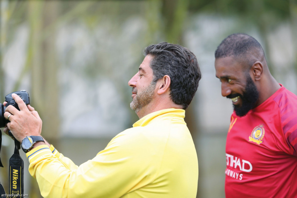 صورة التقطت أمس للبرتغالي روي فيتوريا يُطلع وليد عبد الله على ما صوَّرته عدسته أثناء التدريبات تصوير: عبد العزيز النومان