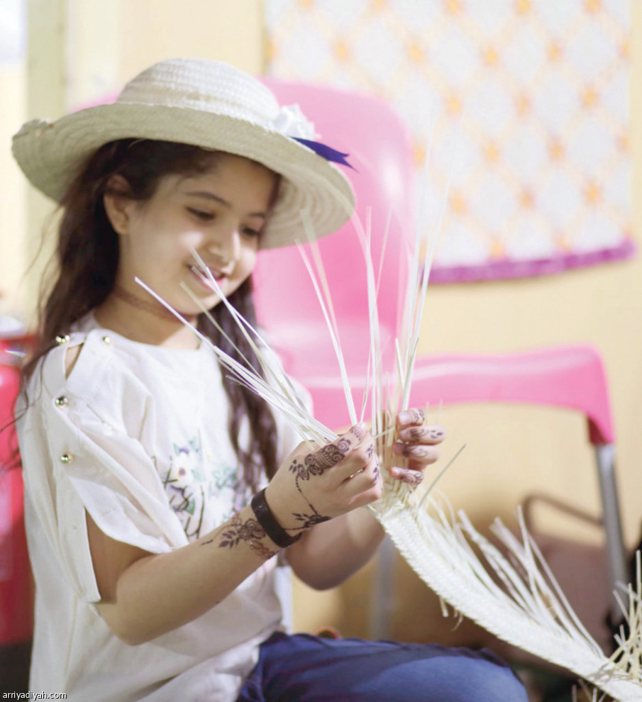 صورة التقطت أمس لطفلة في ركن الحرفيين تؤدي أعمالًا حرفية باستخدام سعف النخل ضمن فعالية الجبل الأبيض في المدينة المنورة (المركز الإعلامي ـ الجبل الأبيض)