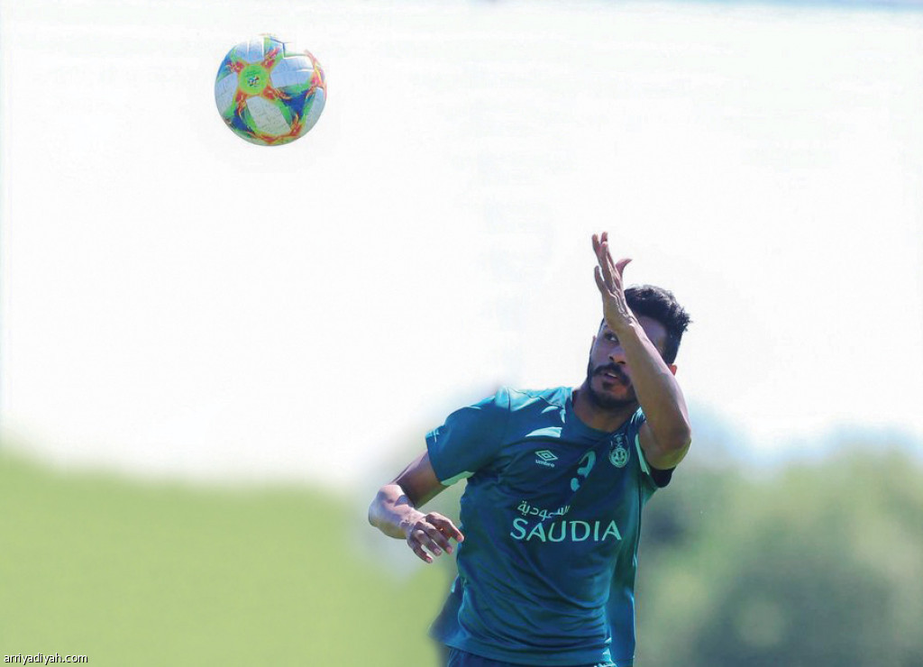 صورة التقطت أمس لمحمد الفتيل مدافع فريق الأهلي الأول لكرة القدم يضرب الكرة برأسه في التدريبات (المركز الإعلامي ـ الأهلي)