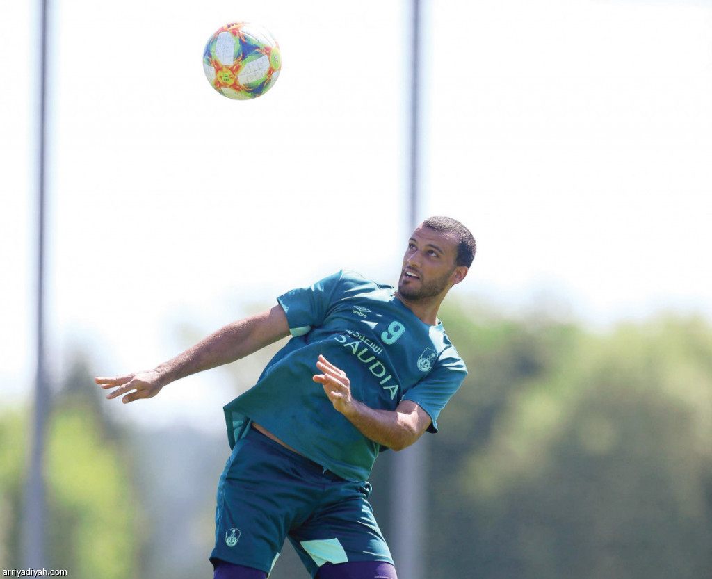 صورة التقطت أمس للسوري عمر السومة يرتقي عالياً لكرة رأسية خلال التدريبات (المركز الإعلامي ـ الأهلي)