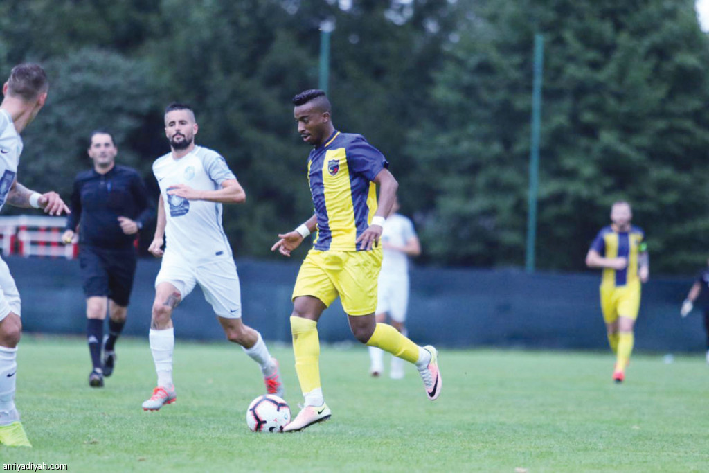 صورة التقطت أمس لعبد الرحمن اليامي مهاجم الحزم يحاول تخطي لاعب سيوفوك المجري في المباراة التجريبية التي انتهت بالتعادل الإيجابي “1/1” (المركز الإعلامي - الحزم)