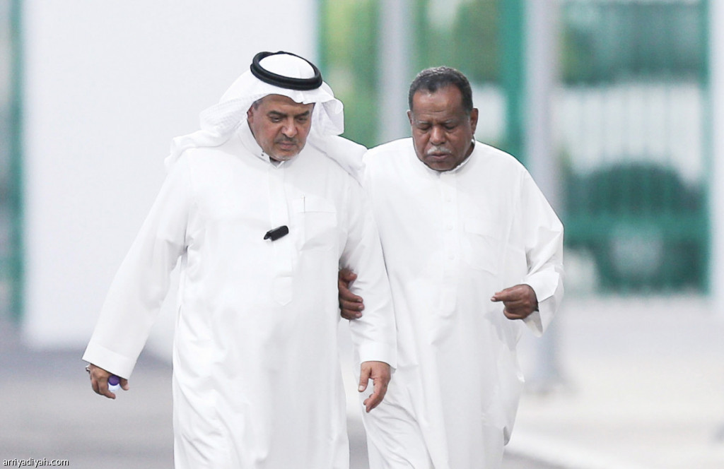 صورة التقطت أمس لمنصور بن مشعل المشرف العام على كرة القدم يسير برفقة العم عمران المسؤول عن الملابس في النادي داخل مقر الأهلي في جدة تصوير: وهبان خبتي