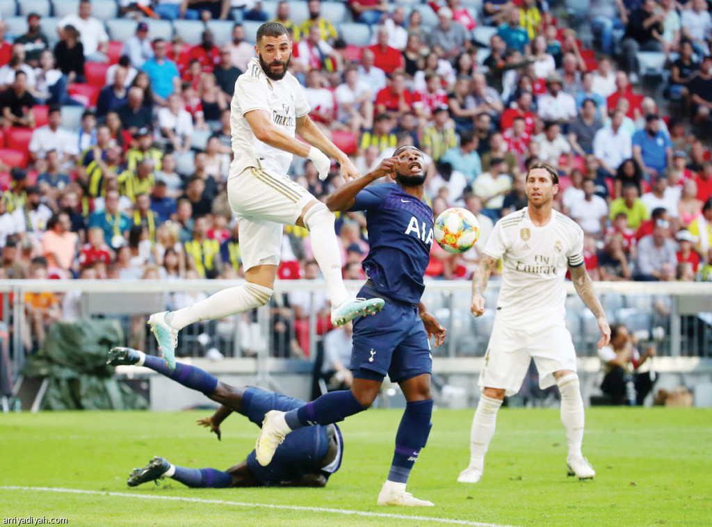 خسر ريال مدريد ثالث مبارياته التجريبية 0ـ1 أمس أمام توتنهام الإنجليزي في المباراة التي جمعتهما ضمن بطولة كأس أودي التجريبية في ألمانيا. ويدين توتنهام بالفضل في الفوز إلى هارين كين الذي سجل هدف المباراة الوحيد في الدقيقة 22. ويلتقي توتنهام في المباراة النهائية اليوم مع الفائز في المباراة التي تجمع بايرن ميونيخ الألماني مع فناربخشة التركي.. وفي الصورة التي التقطت أمس يظهر الفرنسي كريم بنزيمة في صراع على الكرة مع جافيت تانجا لاعب توتنهام وسط مراقبة من سيرجيو راموس قائد الريال (رويترز)