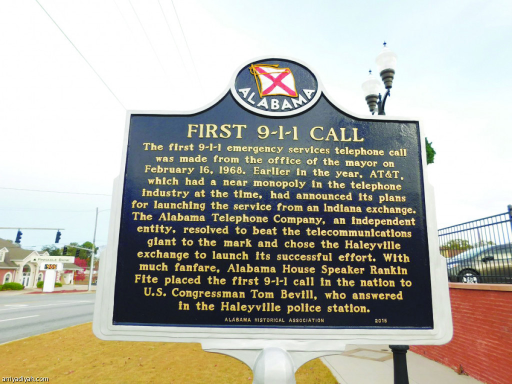 تتدلى من أعمدة شوارع مدينة هاليفيل، في ولاية ألاباما، لافتات توثّق أنها موطن أول مكالمة طوارئ أجريت في أمريكا، على الرقم الثلاثي الشهير “911”، وذلك قبل 51 عامًا.