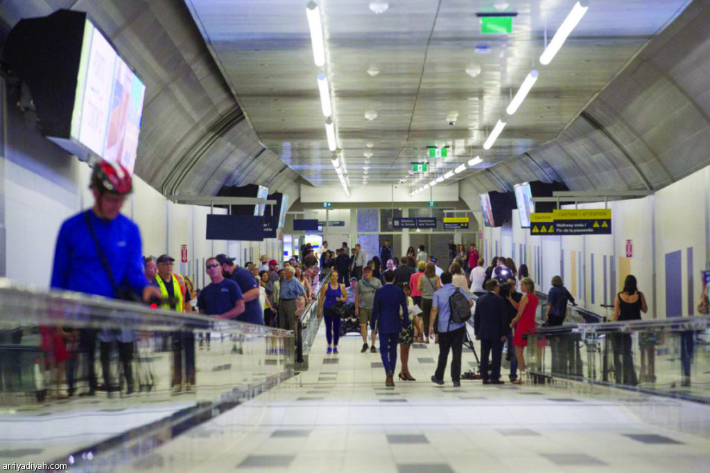 صورة التقطت لمسافرين يسيرون داخل نفق مشاة في مطار بيلي بيشوب في تورونتو(أرشيفية)