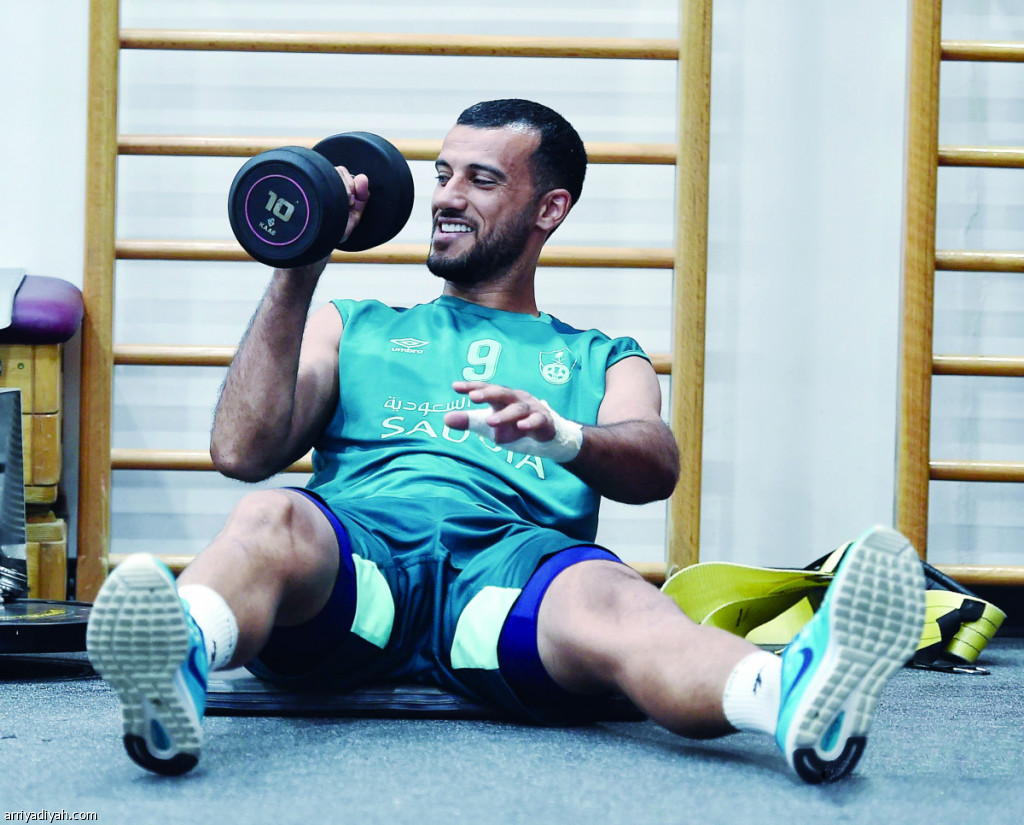 صورة التقطت أمس للسوري عمر السومة مهاجم فريق الأهلي الأول لكرة القدم يقوي عضلاته في صالة الحديد المغلقة (المركز الإعلامي - الأهلي)