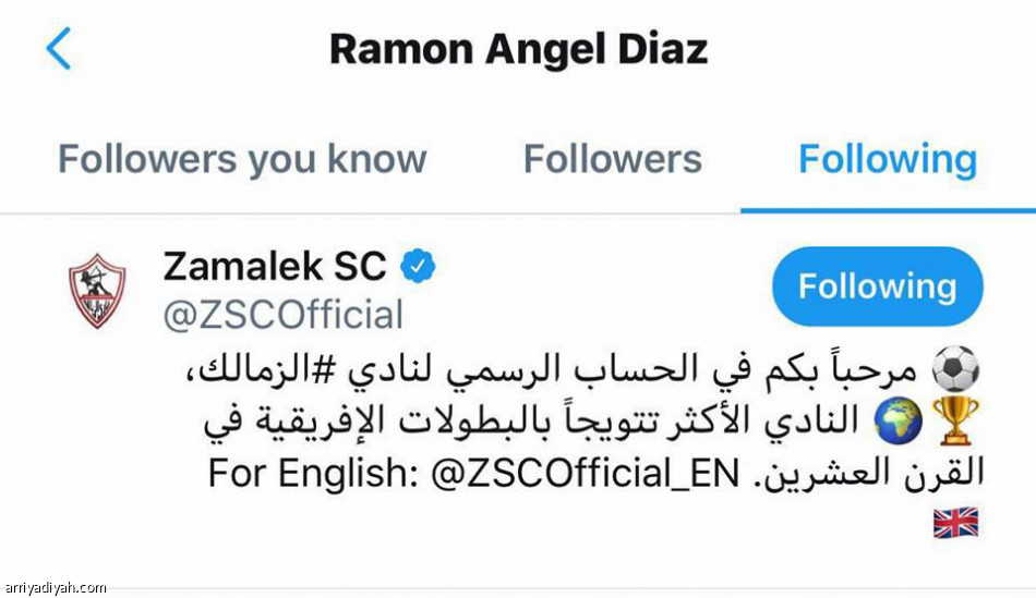 اقترب الأرجنتيني رامون دياز المدير الفني السابق لنادي الهلال، من تدريب نادي الزمالك، بعد قيام دياز بمتابعة الحساب الرسمي لنادي الزمالك عبر موقع التواصل الاجتماعي "تويتر"، ليزيد من احتمالية وجوده مع الزمالك الموسم الجديد.