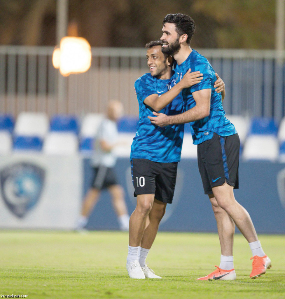 صورة التقطت أمس لعمر خربين ومحمد الشلهوب لاعبَي الهلال يتمازحان في الحصة التدريبية التي جرت استعدادا للقاء الأهلي غدًا في ذهاب دور الـ 16 من دوري أبطال آسيا (المركز الإعلامي ـ الهلال)