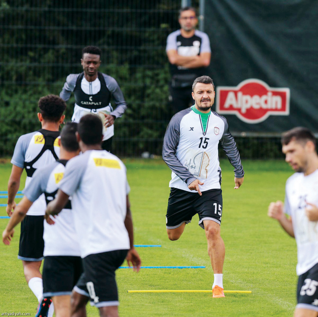 صورة بثها أمس نادي الشباب عبر حسابه في تويتر تُظهر بوديسكو يتدرَّب مع زملائه أثناء حصة صباحية في ألمانيا (المركز الإعلامي ـ الشباب)