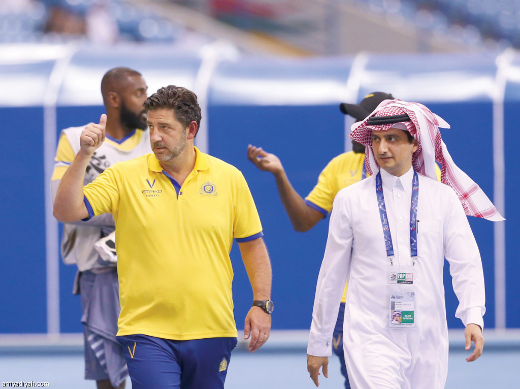 صورة التقطت أمس للبرتغالي فيتوريا مدرب فريق النصر وإلى جابنه عبد الرحمن الحلافي مشرف كرة القدم في النادي عقب نهاية المباراة تصوير: عبد العزيز النومان