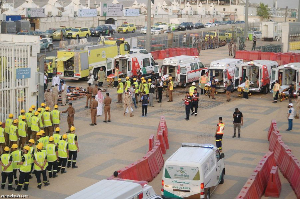 صورة التقطت أمس للقوات المشاركة في فرضية الحريق في محطة القطار "منى 3"(واس)