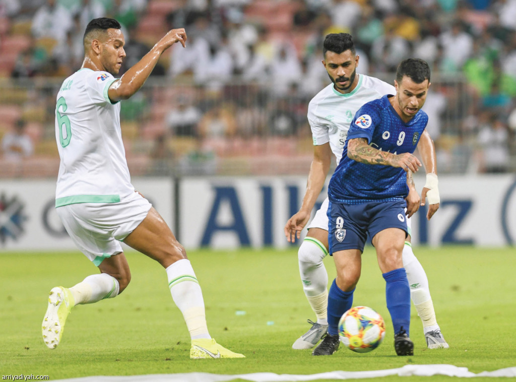 صورة التقطت أمس للإيطالي جيوفنكو لاعب الهلال محاصرًا بالثنائي الفتيل ودي سوزا لاعبي الأهلي تصوير: علي خمج