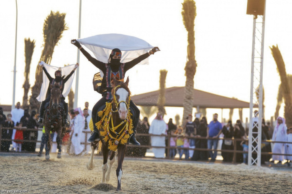 شهدت النسخة الـ13 من سوق عكاظ مشاركة فارسات سعوديات للمرة الأولى، إذ قدمن عروضًا مختلفة تتمثل في السيف، والرمح، والتحية على ظهر الخيل.. وفي الصورة التي التقطت أمس فارسة سعودية تقدم أحد العروض
