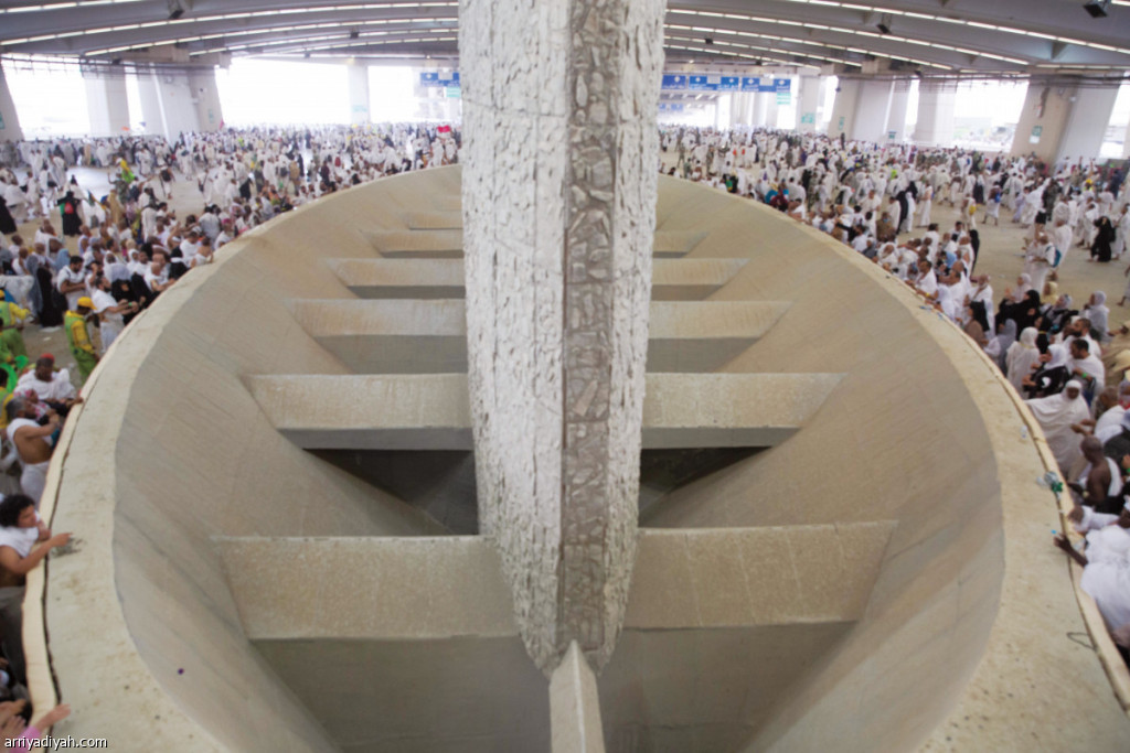 صورة التقطت أمس لحجاج حول شاخص الجمرة في مشعر منى تصوير: عدنان مهدلي