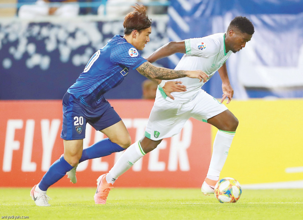 صورة التقطت أمس لدجانيني مهاجم الأهلي ينطلق بالكرة وسط مضايقة جانج هيون سون مدافع الهلالتصوير: سعد العنزي
