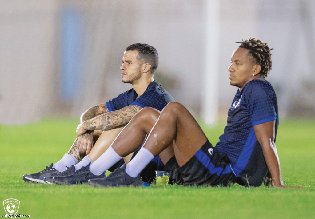 صورة التقطت أمس الأول للبيروفي كاريلو والإيطالي جيوفينكو لاعبي فريق الهلال الأول لكرة القدم على أرضية ملعب النادي أثناء التدريبات (المركز الإعلامي ـ الهلال)