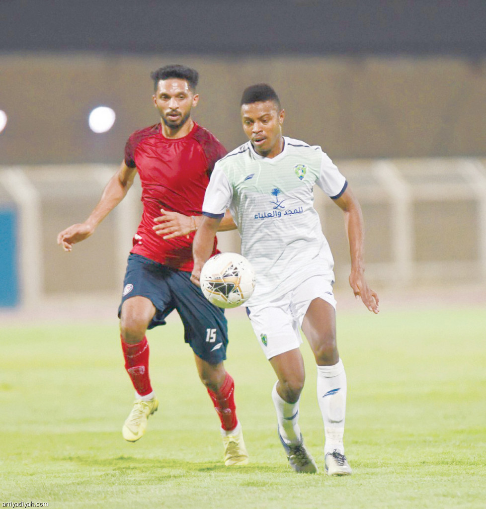 صورة التقطت أمس لمحمد الضو مهاجم الفتح "سعودي المولد" ينطلق بالكرة وسط ملاحقة عبد الله الهميان لاعب وسط العدالة في المباراة التجريبية بين الفريقين (المركز الإعلامي . الفتح)