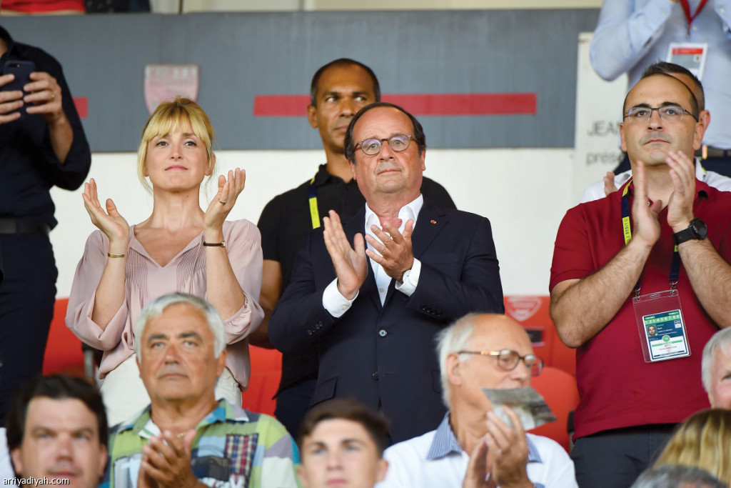 صورة التقطت أمس لفرانسوا هولاند الرئيس الفرنسي السابق وجولي جايت الممثلة الفرنسية يتابعان مباراة نيم ونيس في الدوري الفرنسي على ملعب كوستيريس في نيم جنوب فرنسا