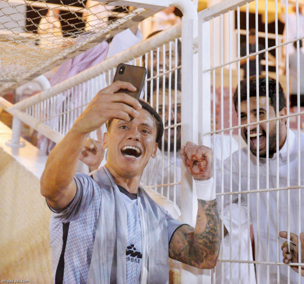 صورة التقطت أمس للبرازيلي لويز إدواردو لاعب فريق الطائي الأول لكرة القدم يأخذ "سيلفي" مع أحد المشجعين احتفالًا بالفوز على البكيرية بعد أن سجل الهدف الأول لفريقه (المركز الإعلامي - نادي الطائي)