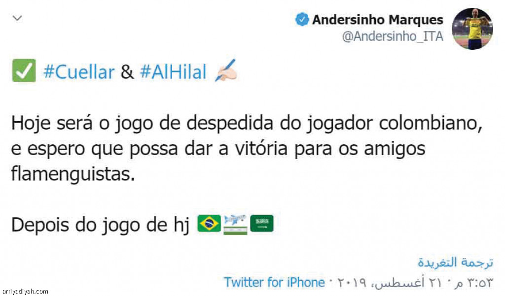 من جانب آخر، كشف أندرسينيو ماركيز، المعلق والصحافي الإيطالي المهتم بأخبار اللاعبين البرازيليين، بتغريدة في حسابه على "تويتر"، عن أن جوستافو كويلار، اللاعب الكولومبي، سيذهب إلى الهلال بعد انتهاء لقاء فريقه أمام إنترناسيونال البرازيلي، في ربع نهائي كوبا الليبارتادوريس، فجر الخميس، حيث ستكون هذه المباراة الأخيرة له، ومن بعدها سيرحل إلى النادي الأزرق.