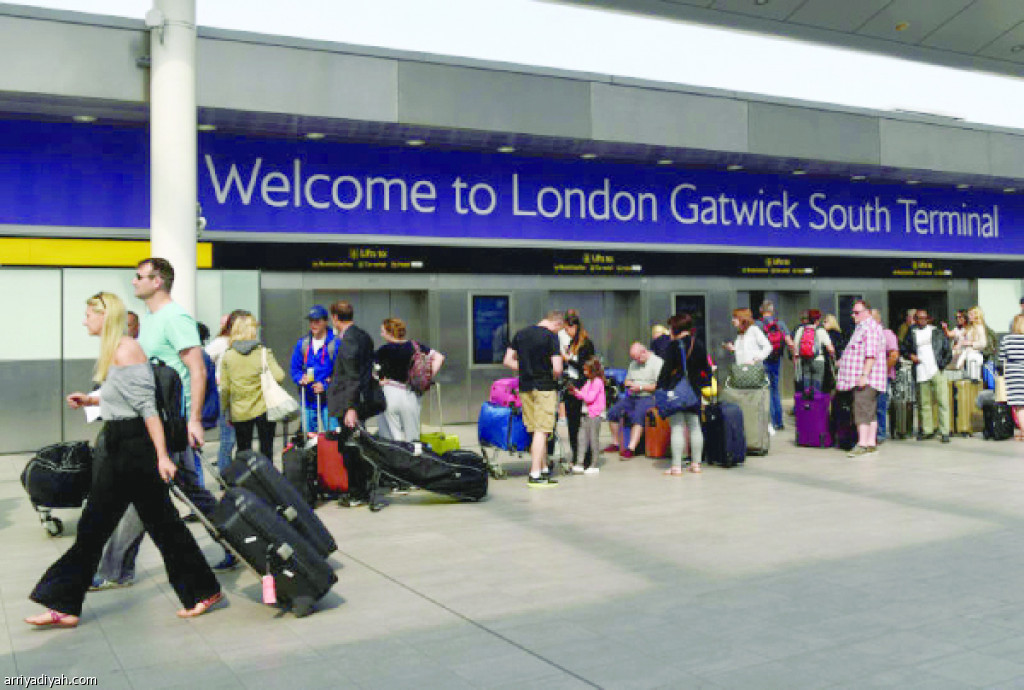 صورة التقطت لمسافرين أمام بوابة صالة في مطار جاتويك جنوب لندن (أرشيفية)