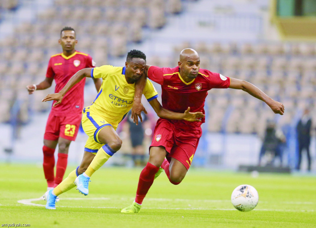 صورة التقطت أمس للبرازيلي جورجي مدافع ضمك والنيجيري أحمد موسى مهاجم النصر يتصارعان على الكرةتصوير: عبد العزيز النومان