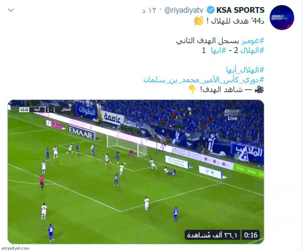 ونشر حساب القناة الرياضية السعودية الرسمي في موقع التواصل الاجتماعي "تويتر" ستة مقاطع لأهداف اللقاء، الذي انتهى بانتصار الهلال على أبها 4ـ2، ونالت 239.106 مشاهدات.