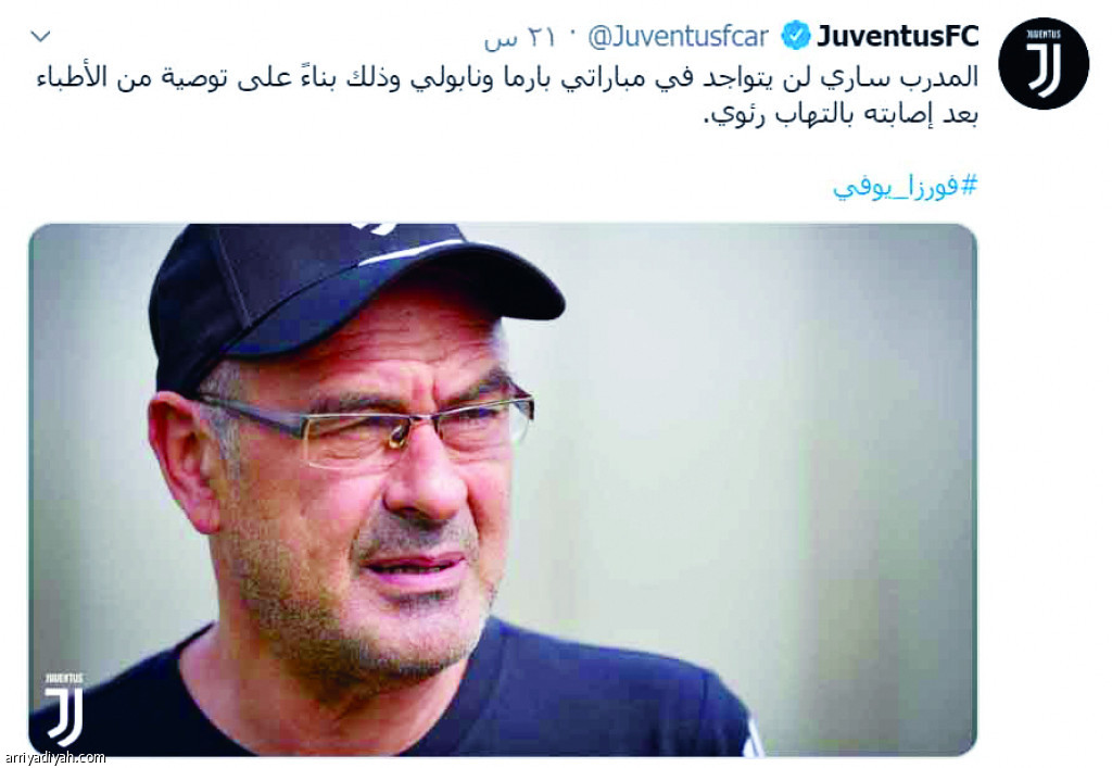 أعلن نادي يوفنتوس عبر حسابه في موقع التواصل الاجتماعي "تويتر" غياب ماوريسيو ساري، مدربه، خلال الجولتين الأولى والثانية من الدوري. ويتعافى ساري حاليًّا بشكل جيد من الالتهاب الرئوي، لكنه لن يكون قادرًا على الوجود في مقاعد بدلاء اليوفي في المباراتين.