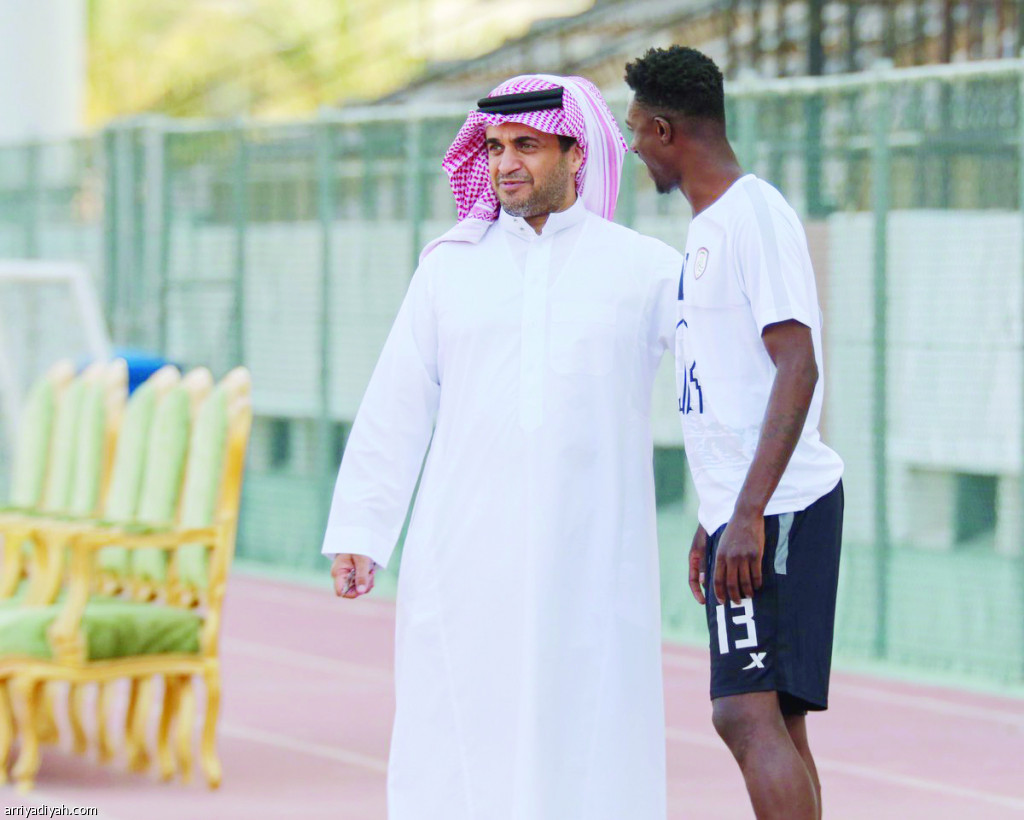 صورة التقطت أمس للبلطان متحدثًا إلى حسن معاذ لاعب الفريق الأول لكرة القدم قبيل بدء الحصة التدريبية للشباب استعدادًا لمباراة الفتح اليوم (المركز الإعلامي ـ الشباب)