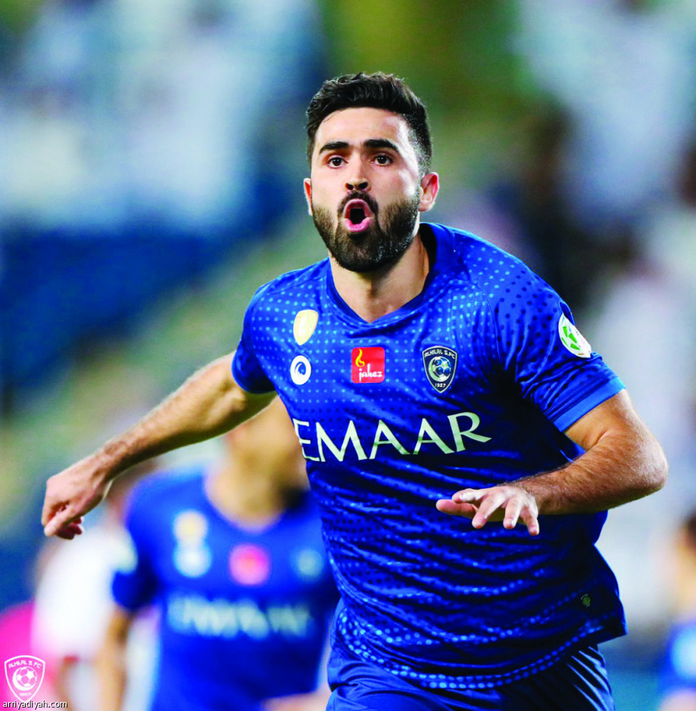 صورة التقطت أمس للسوري عمر خربين مهاجم فريق الهلال الأول لكرة القدم يصرخ فرحًا بعد تسجيله الهدف الرابع في مرمى أبها خلال مواجهة الفريقين ضمن الجولة الأولى من دوري كأس محمد بن سلمان للمحترفين (المركز الإعلامي ـ الهلال)