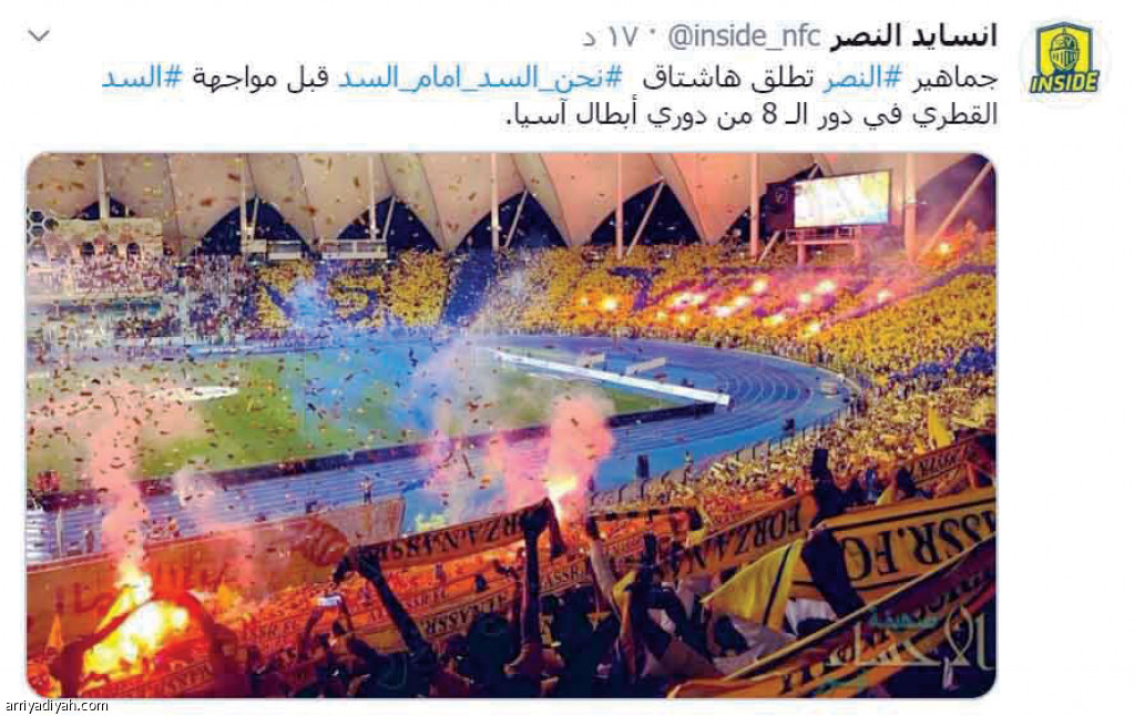 أطلقت الجماهير النصراوية هاشتاقًا في موقع التواصل الاجتماعي "تويتر"، حمل عنوان #نحنالسدأمام_السد، لتحفيز المشجعين على الحضور في مباراة فريقها أمام السد القطري اليوم ضمن دور الثمانية من دوري أبطال آسيا.