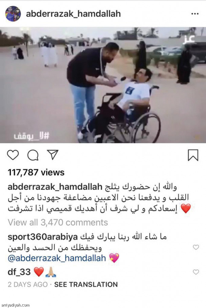نشر المغربي عبد الرزاق حمدالله مهاجم فريق النصر الأول لكرة القدم على حسابه في "إنستجرام" مقطع فيديو لحوار أجري مع مشجع نصراوي مقعد وهو يتحدث عن حضوره إلى الملعب لتشجيع فريقه في المباراة الدورية الأخيرة تلبية لدعوة حمدالله وذلك بعد غيابه 10 أعوام عن حضور المباريات.
