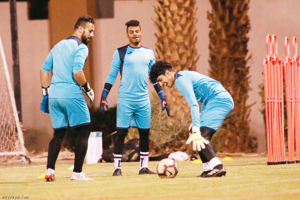 صورة التقطت أمس لحراس مرمى فريق أحد أثناء التدريبات استعدادًا للقاء الأنصار (المركز الإعلامي ـ أحد)