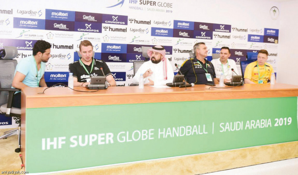 صورة التقطت أمس من المؤتمر الصحافي لفيليب مدرب كيل وميشيل مدرب سيدني ويتوسطهما الزميل فهد البطاح