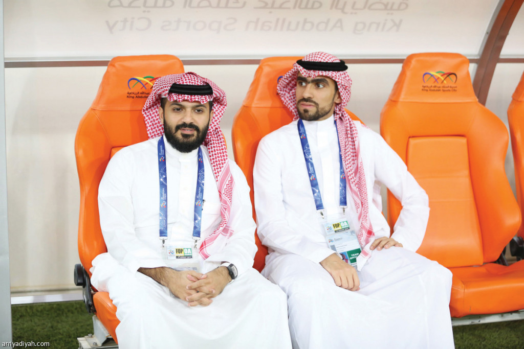 صورة التقطت أمس لأنمار الحائلي رئيس الاتحاد وعبدالله كعكي نائبه على دكة البدلاء قبل بداية مباراة الفريق أمام الهلال تصوير: عدنان مهدلي