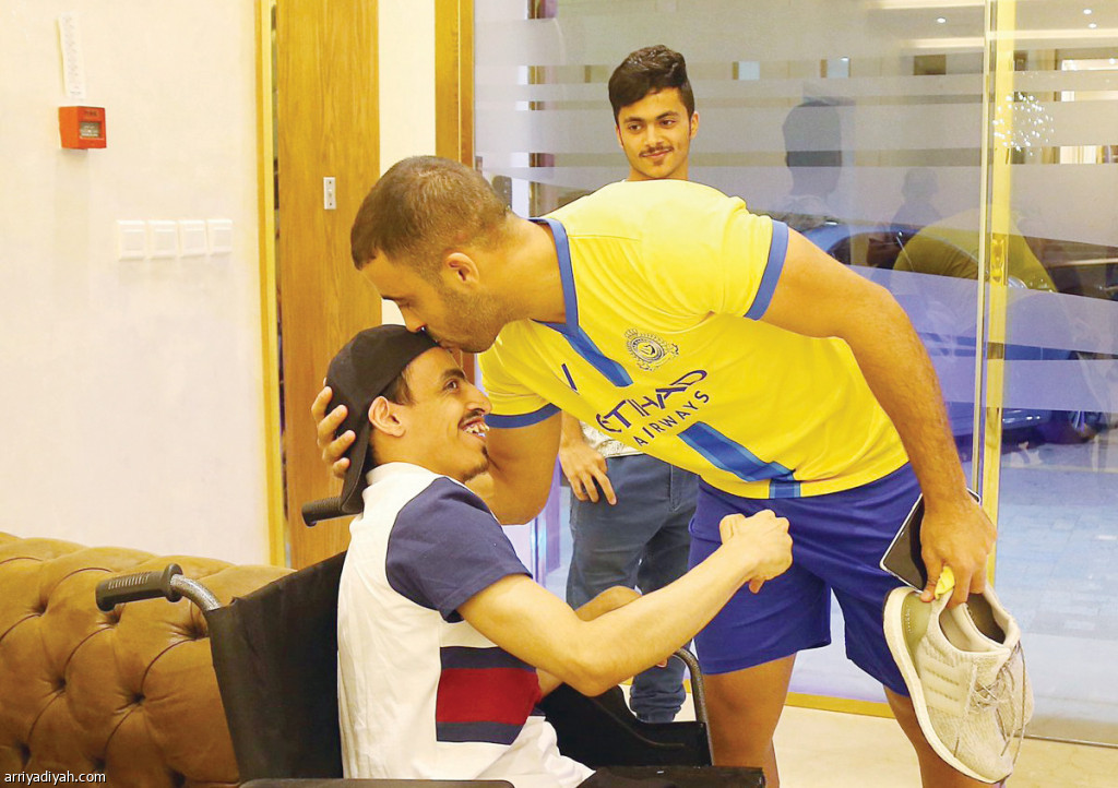 صورة التقطت أمس للمغربي عبد الرزاق حمد الله مهاجم فريق النصر الأول لكرة القدم يقبّل رأس مشجع من ذوي الاحتياجات الخاصة دعاه إلى النادي لإهدائه قميصه الشخصي بعدما كشف المشجع في مقطع متداول عن حضوره مباراة افتتاح دوري كأس محمد بن سلمان للمحترفين أمام ضمك الخميس الماضي تلبية لمطالبة المغربي جمهور الأصفر بتكثيف الدعم (المركز الإعلامي ـ النصر)