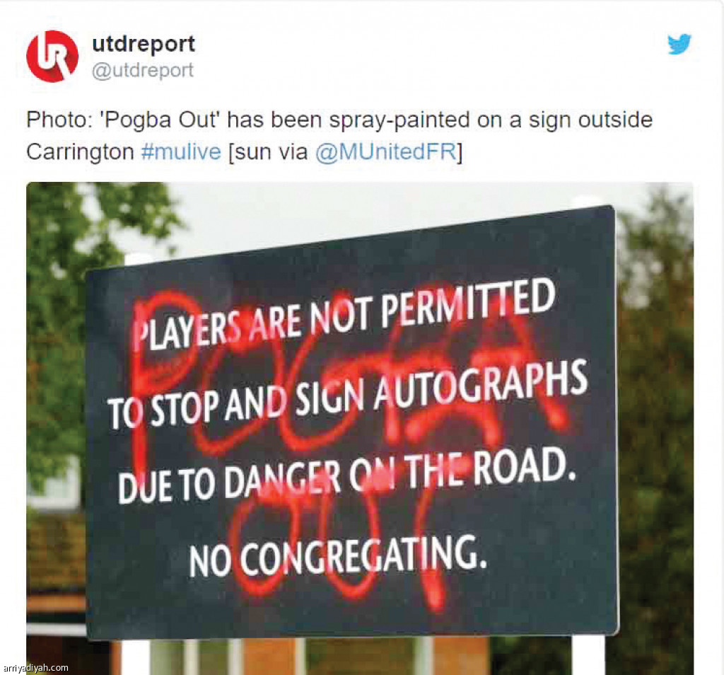 خرَّبت مجموعة من جماهير فريق مانشستر يونايتد الإنجليزي لافتة خاصة بالنادي خارج مقر تدريب الفريق، وطالبت من خلالها بضرورة رحيل بول بوجبا.