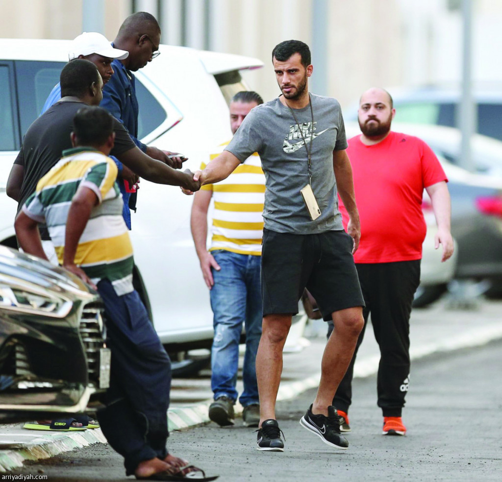 صورة التقطت أمس للسوري عمر السومة مهاجم فريق الأهلي الأول لكرة القدم يصافح عاملين في النادي لحظة وصوله إليه للدخول في التدريبات قبل الأخيرة استعدادًا لمواجهة الاتفاق تصوير: وهبان خبتي