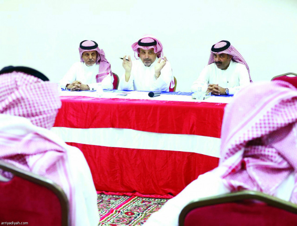 صورة التقطت أمس الأول لعبد الغالي الحربي نائب رئيس أبها يتحدث لممثلي الجمهور متوسطًا خالد شايع ومحمد معيض عضوي مجلس إدارة النادي (خاصة بالرياضية)