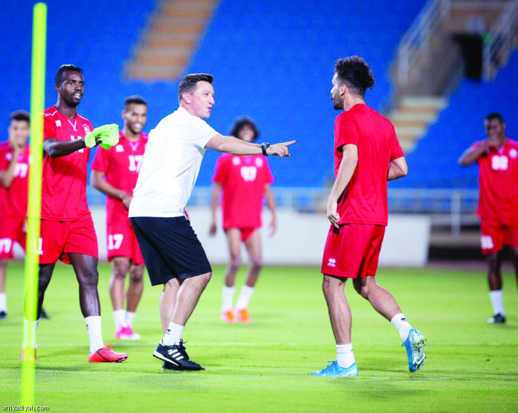 صورة التقطت أمس الأول للبلجيكي هاسي مدرب الرائد يوجه متعب المطلق أثناء التدريبات (المركز الإعلامي ـ الرائد)