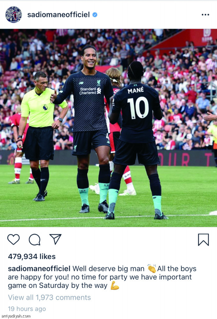 بارك السنغالي ساديو ماني، لاعب فريق ليفربول الإنجليزي، للهولندي فان دايك، زميله في الفريق، بحصوله على جائزة "أفضل لاعب في أوروبا" عبر حسابه في موقع التواصل الاجتماعي "إنستجرام".