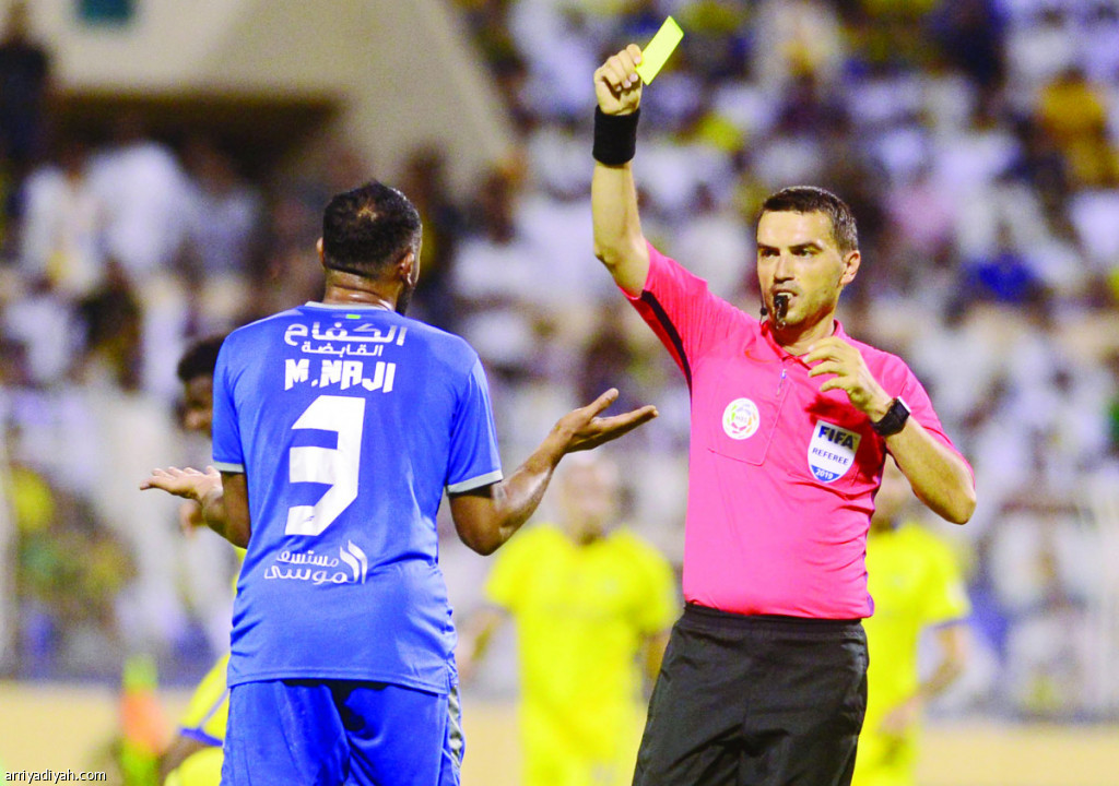 صورة التقطت أمس للروماني أوفيديو يشهر البطاقة الصفراء لمحمد ناجي لاعب الفتح تصوير: محمد الدويسان