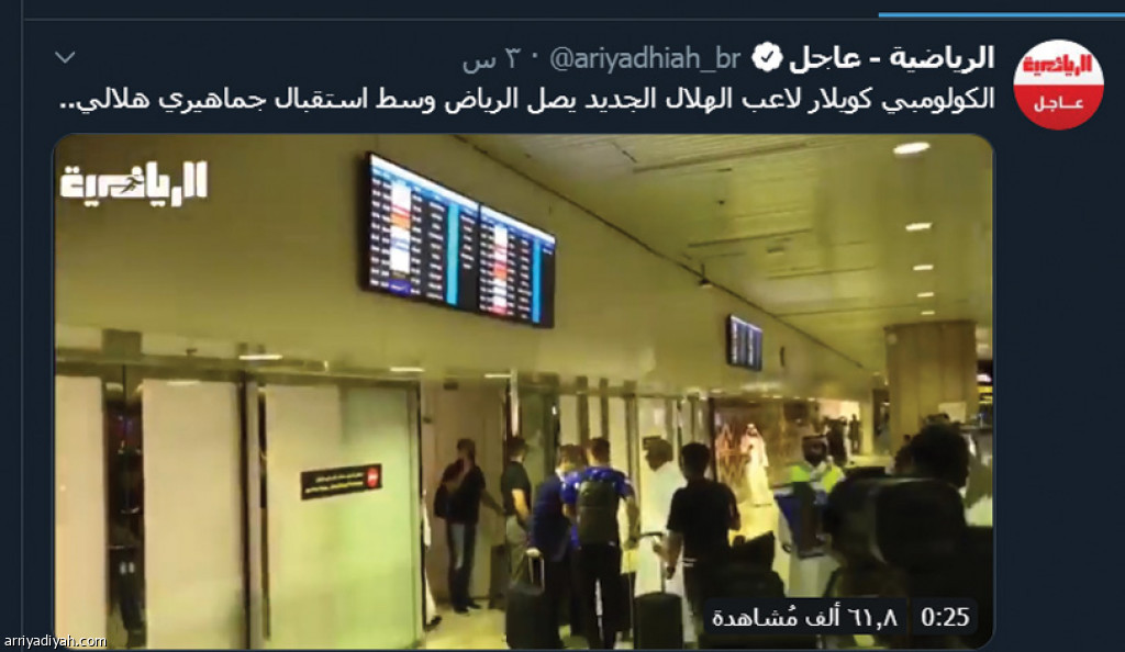 وجد مقطع الفيديو الذي نشرته "الرياضة" عبر حسابها على "تويتر" لوصول الكولومبي جوستافو كويلار لاعب فريق الهلال الأول لكرة القدم 41 ألف مشاهدة خلال ساعة فقط.