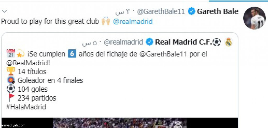 احتفي نادي ريال مدريد الإسباني عبر حسابه على موقع التواصل الاجتماعي “تويتر” بمرور 6 أعوام من انضمام الويلزي جاريث بيل إلى صفوفه، بعد أن كان يسعى بقوة إلى بيع عقده. ونشر النادي مقطع فيديو لأول هدف سجله بيل في الغريم برشلونة بعد أن انطلق بالكرة قبل منتصف الملعب حتى وضعها في الشباك، مع تضمين أرقام اللاعب ورد الويلزي على ناديه بتغريدة كتب فيها “فخور باللعب لهذا النادي العظيم”.