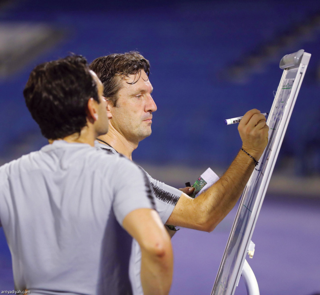صورة التقطت أمس للفرنسي لورين مساعد مدرب المنتخب السعودي يرسم مخطط التدريبات وسط متابعة أحد زملائه تصوير: عيسى الدبيسي