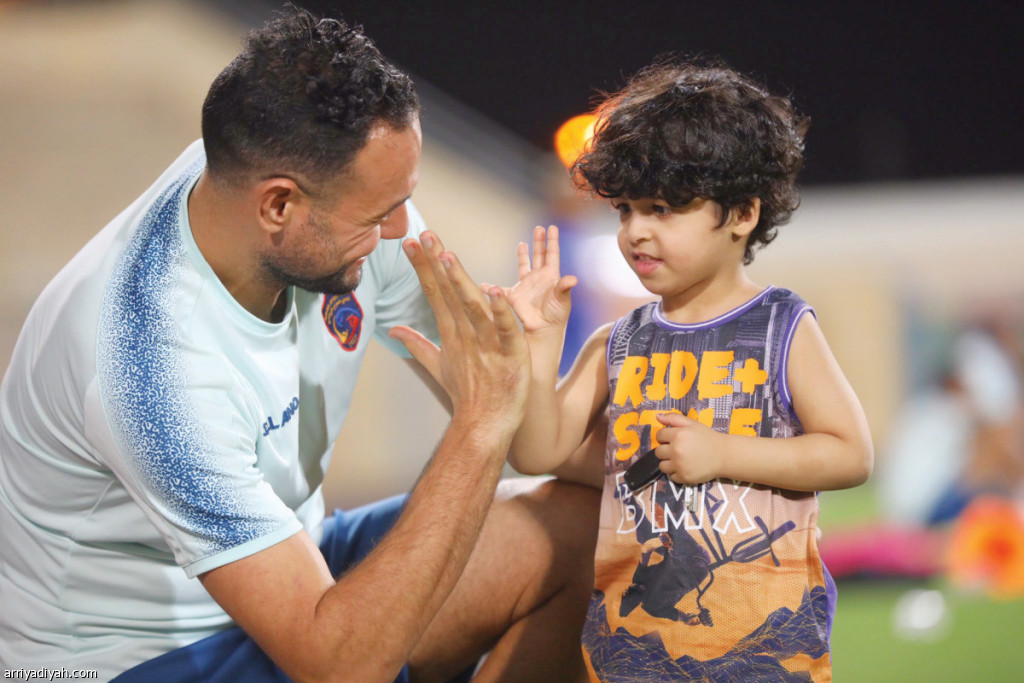 صورة التقطت أمس للطفل أصيل ابن الدكتور فهد العايد مدير الاحتراف في فريق الحزم لحظة ممازحته التونسي مرتضى مترجم الفريق تصوير: فهد البطاح