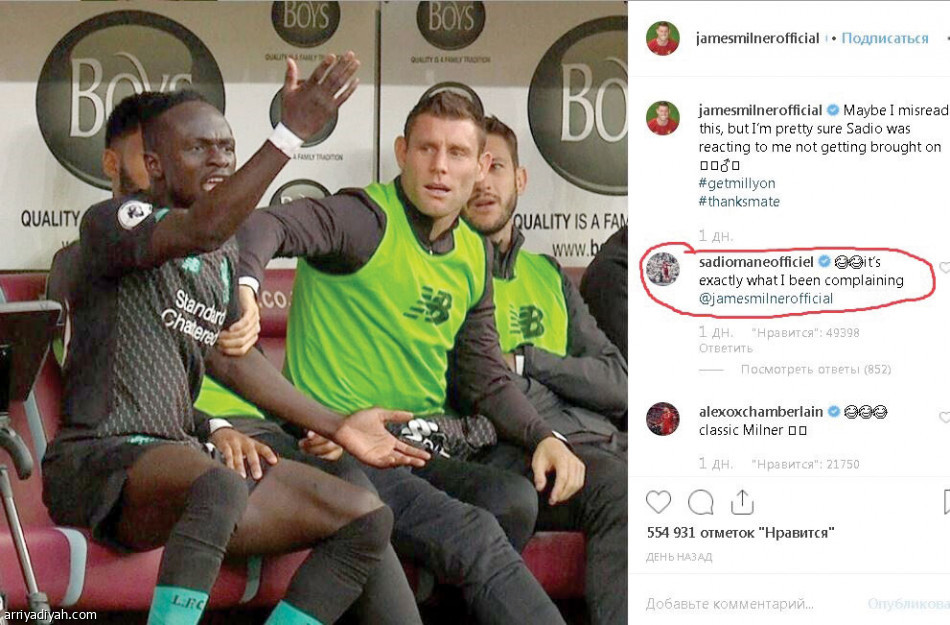 وكان جيمس ميلنر، لاعب ليفربول، نشر عبر حسابه في "إنستجرام" صورةً لانفعال ماني على دكة البدلاء أثناء جلوسه إلى جانبه، وعلَّق عليها: "ربما أخطأت في قراءة هذا، لكنني متأكد من أن ماني كان منفعلًا بسبب جلوسي على الدكة". ورد ماني على تدوينة ميلنر ضاحكًا: "هذا بالضبط ما كنت أتذمَّر منه".